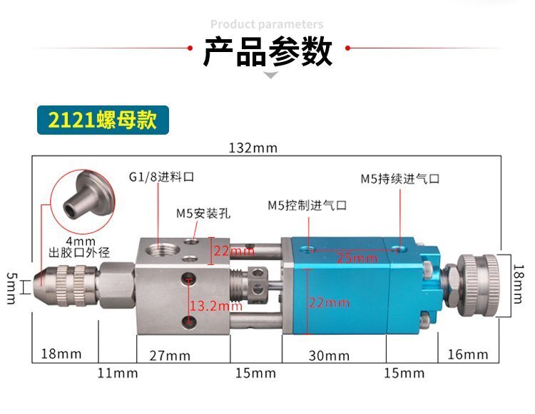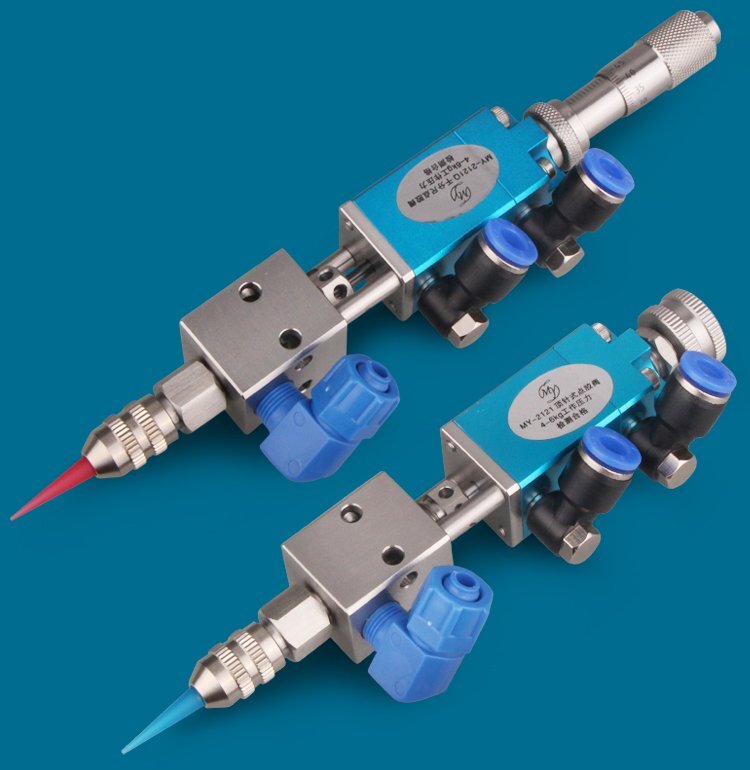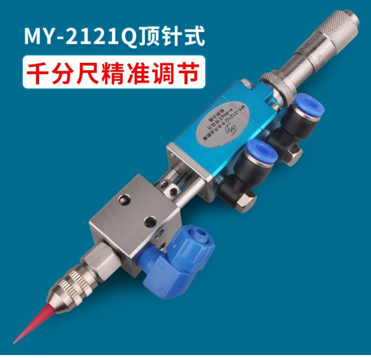 MY-2121精密頂針式單液閥,雙向驅動,可調行程,出咀針頭可用針頭帽固定或直 接旋取;適用流動性好,低粘度性水狀流體,如UV膠、墨水、酒精等;可與各種供料泵或儲料壓力桶使用,可接各式點膠針頭,可與全自動點膠機裝配數個點膠閥同時點膠作業;采用鋁合金陽極化+不銹鋼優質材料制造,不生銹防腐蝕,適合工程/工廠長期生產使用;有大量現貨供應,歡迎咨詢采購!