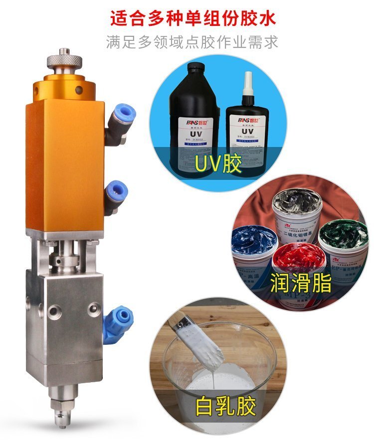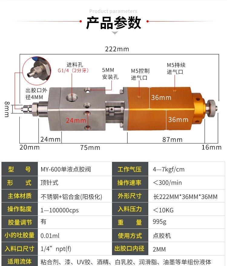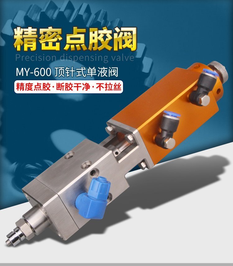 MY-600大流量頂針式單液閥,適合流動性好、中粘度性的材料,如:潤滑脂、粘合 劑、酒精、墨水、UV膠、漆、油等;可與各種供料泵或儲料壓力桶使用,可接各式點膠針頭,可與全自動點膠機裝配數個點膠閥同時點膠作業;采用鋁合金陽極化+不銹鋼優質材料制造,不生銹防腐蝕,適合工程/工廠長期生產使用;有大量現貨供應,歡迎咨詢采購!