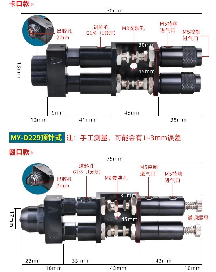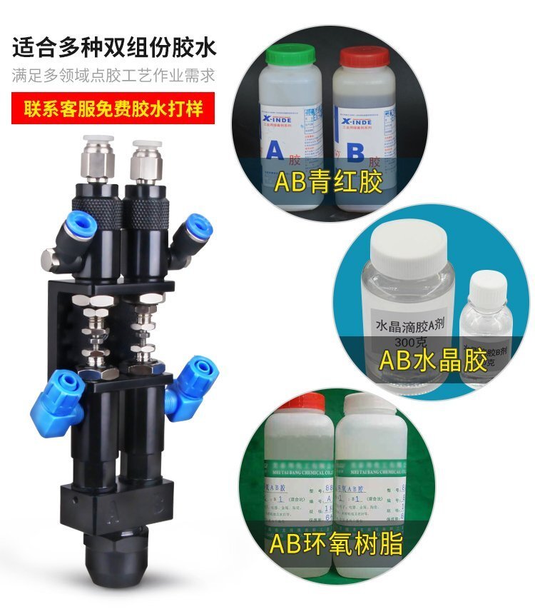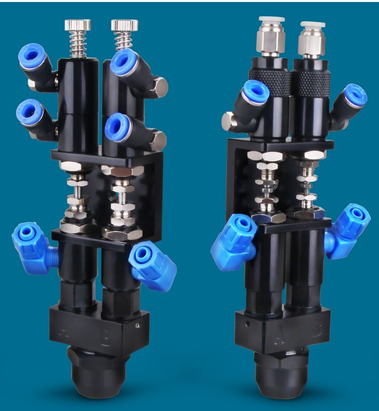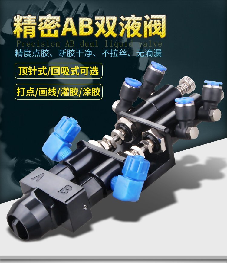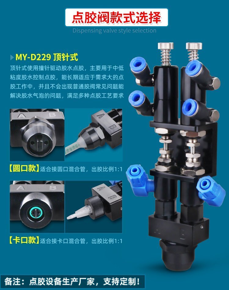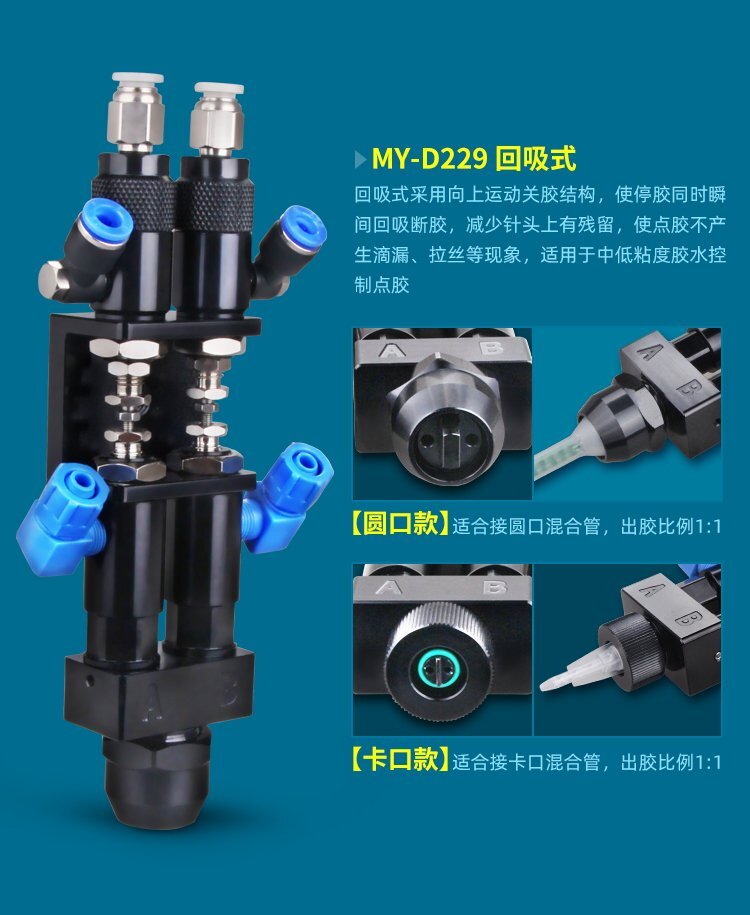 MY-D299AB雙液閥,有【頂針式卡口/回吸式卡口/回吸式圓口】三款可選,適合中低粘度性的AB雙組份膠水,如:封灌黑膠、AB硅膠、AB青紅膠、AB水晶膠、環氧樹脂膠;出膠量可以微調,膠水比例1:1精確出膠,具有回吸功能,避免拉絲現象,可接各式點膠針頭;采用聚甲醛+氟塑膠+不銹鋼優質材料制造,不生銹防腐蝕,適合工程/工廠長期生產使用;有大量現貨供應,歡迎咨詢采購!