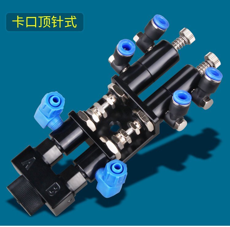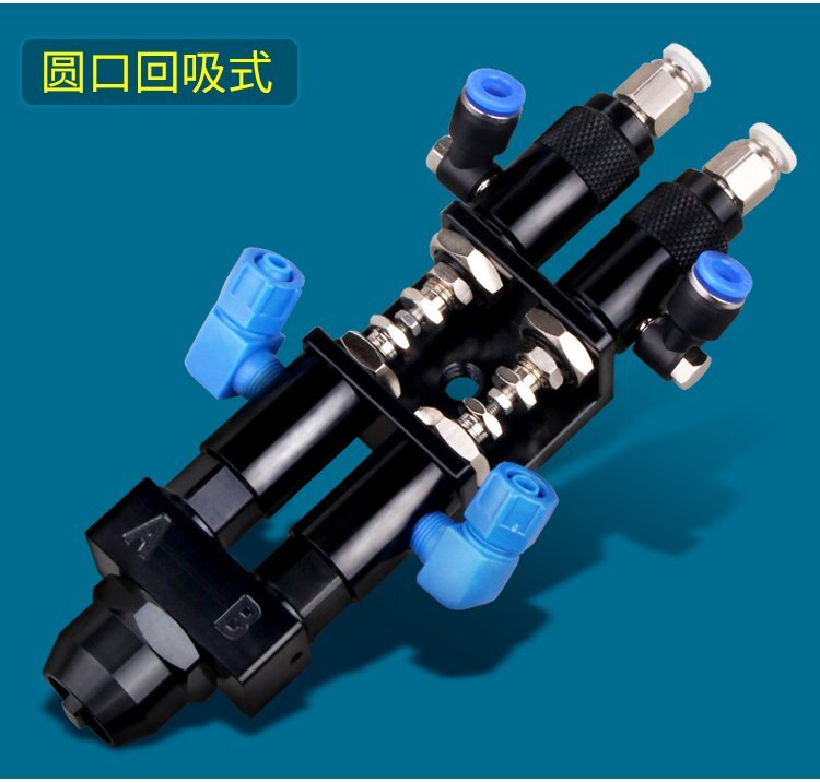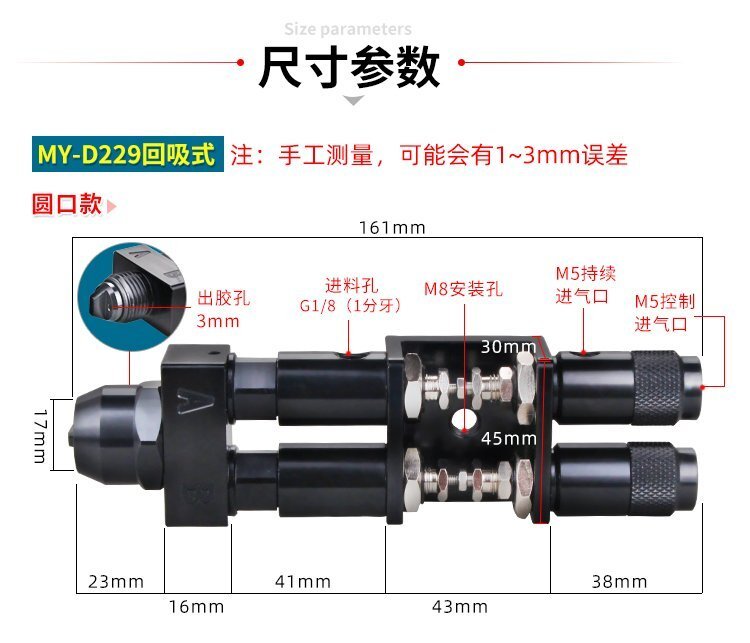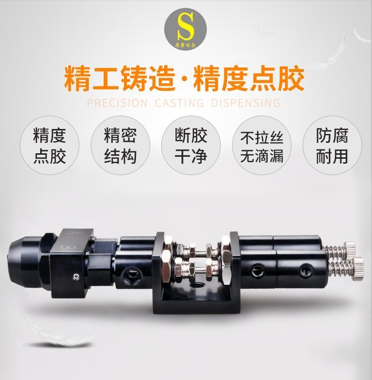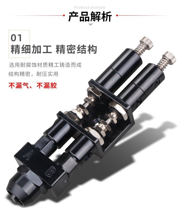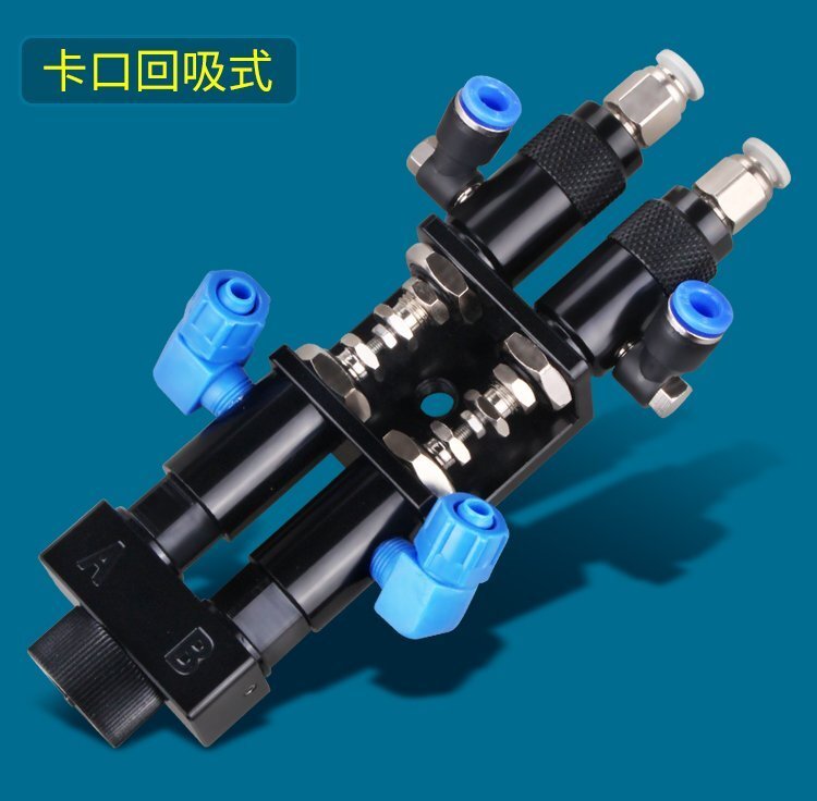 MY-D299AB雙液閥,有【頂針式卡口/回吸式卡口/回吸式圓口】三款可選,適合中低粘度性的AB雙組份膠水,如:封灌黑膠、AB硅膠、AB青紅膠、AB水晶膠、環氧樹脂膠;出膠量可以微調,膠水比例1:1精確出膠,具有回吸功能,避免拉絲現象,可接各式點膠針頭;采用聚甲醛+氟塑膠+不銹鋼優質材料制造,不生銹防腐蝕,適合工程/工廠長期生產使用;有大量現貨供應,歡迎咨詢采購!
