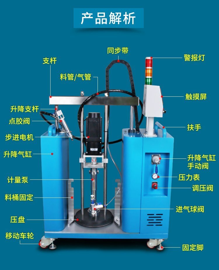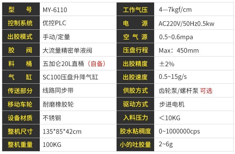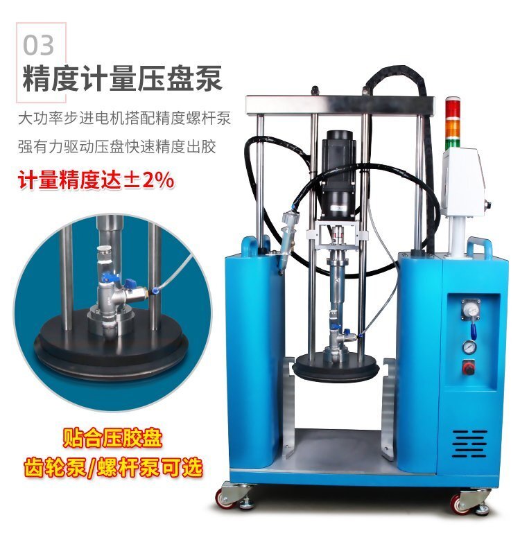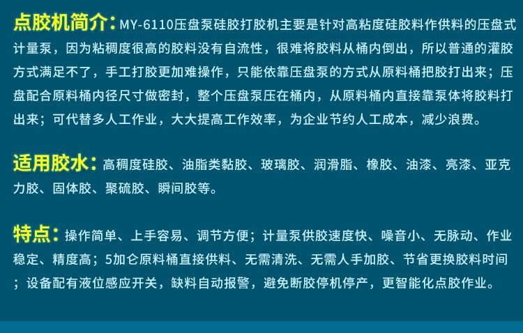 MY-6110高粘度壓盤點膠機,是由本公司自主研發設計,精密加工制造的一款高粘度硅膠壓盤泵單液點膠機,采用步進機驅動,齒輪泵/螺桿泵送料,使膠水能夠連續穩定輸出,精度高;主要用在電子行業、LED行業、工藝品行業等廣泛應用;具有高壓強出膠,升降大氣缸,出膠快速,持續穩定,高粘度膠水輕松壓出、快速調試設置出膠量、精度點膠、定時定 量出膠、智能檢測機器故障報警等功能;適合多種單組份膠水,如:高稠度硅膠、油脂類黏膠、玻璃膠、聚硫膠、潤滑脂、亞克力膠、油漆、固體膠、橡膠、亮漆、瞬間膠等工業膠水;出膠頭配置精密單液閥
