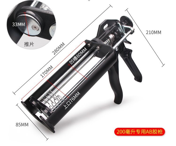此款膠槍為200毫升AB膠筒1:1專用,推桿式結構,打膠高效省力;膠槍整體采用推桿質密金屬材質,防腐蝕不生銹,不彎曲變形,抗壓耐磨,適合工程/工廠長期生產使用;有大量現貨供應,歡迎咨詢采購!