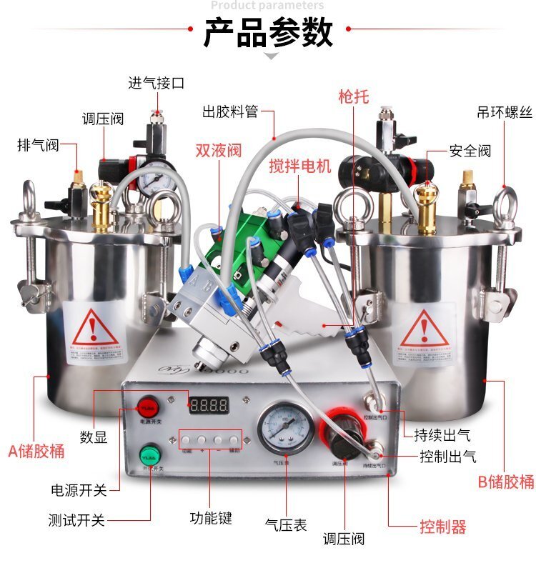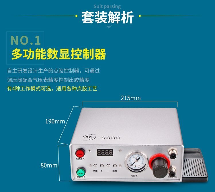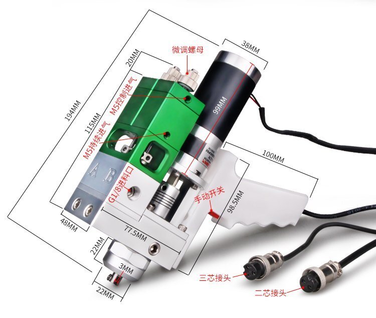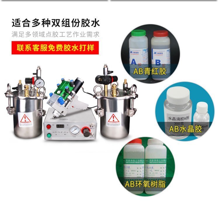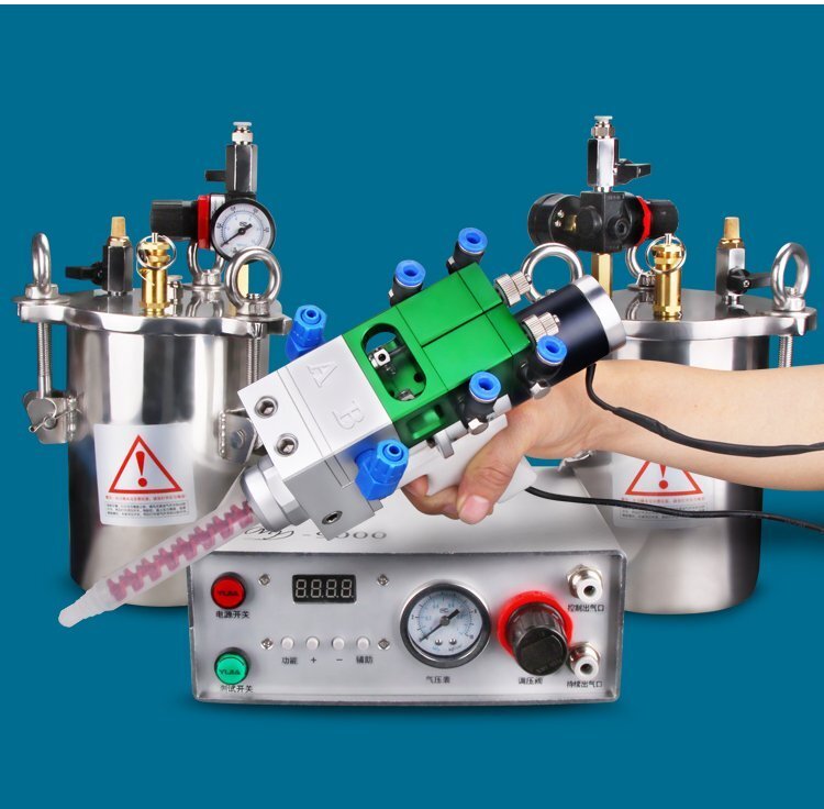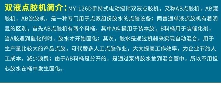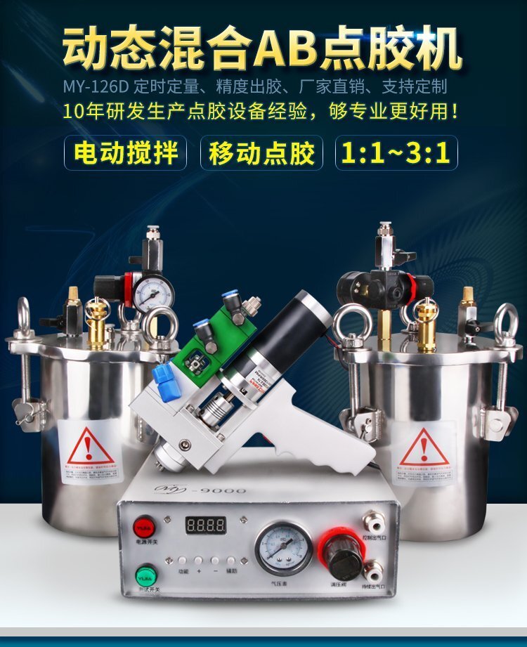 MY-126D手持閥移動點膠機,電動攪拌動態混合,出膠穩定,點膠精度高,不拉絲不滴漏,手持槍托控制,點膠自由輕松,可與各種自動化設備搭配使用;適合多種AB雙組份膠水,如:AB硅膠、封灌黑膠、環氧樹脂、AB水晶膠、AB青紅膠等工業膠水;配合高精密點膠雙液閥,膠水比例可調1:1至3:1,有大量現貨供應,歡迎咨詢采購!