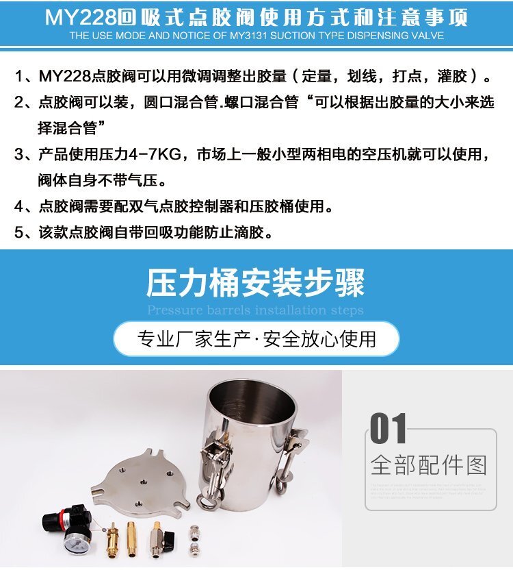 MY-2121全自動點膠機,是由“精密數顯點膠機+壓力桶+單液點膠閥”組合而成的點膠套裝,點膠機功能模式多,操作簡易,穩定高效;點膠閥頂針式,斷膠干凈,不拉絲,不滴漏;套裝具有控制穩定、點膠精度高、應用領域廣泛、套裝組件可靈活更換、使用壽命長、節省成本等優勢,適合工程/工廠長期生產使用;有大量現貨供應,歡迎咨詢采購!