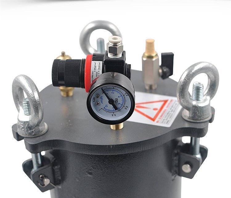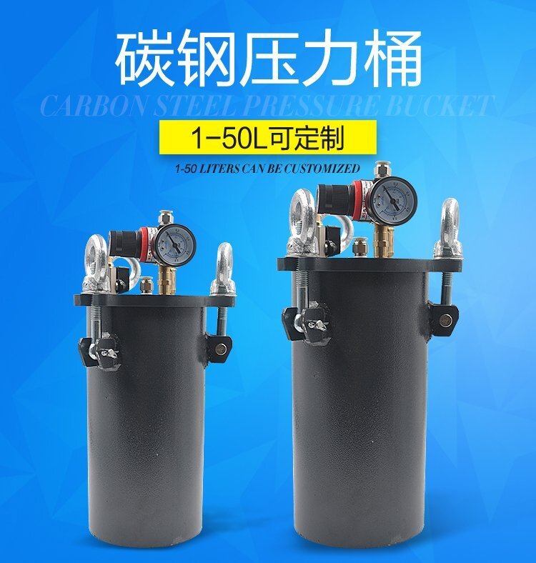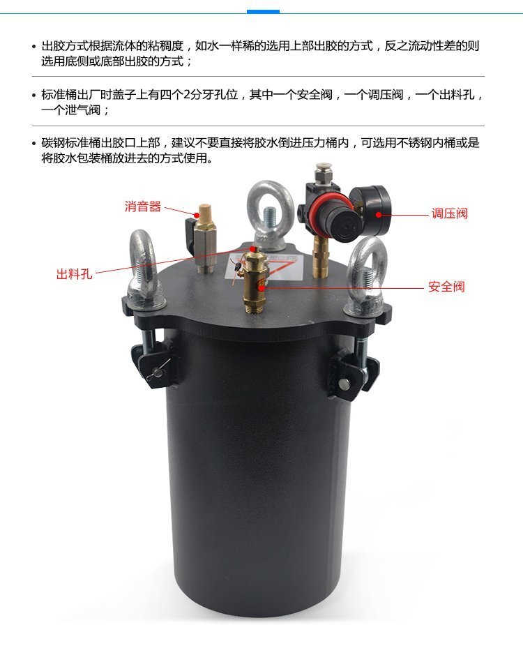 標配桶出廠時蓋子上有四個2分牙孔位,分別為:一個安全閥、一個調壓閥、一個排氣閥、一個出料孔;壓力桶使用碳鋼材料,耐腐蝕性強,加厚的桶壁和桶蓋,安全有保證,在作業中可以放心使用(碳鋼桶出膠口在上部時,建議不要將膠水直接倒進壓力桶內,可選用不銹鋼內桶或將膠水包裝桶再放進去使用);適合工程/工廠長期生產使用;有大量現貨供應,歡迎咨詢采購!